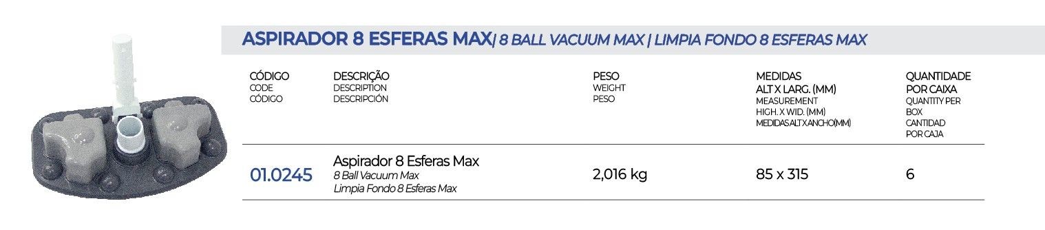 O Aspirador 8 Esferas MAX Brustec combina sucção potente com oito esferas de movimento, garantindo limpeza rápida, prática e profissional em piscinas de diferentes portes.
